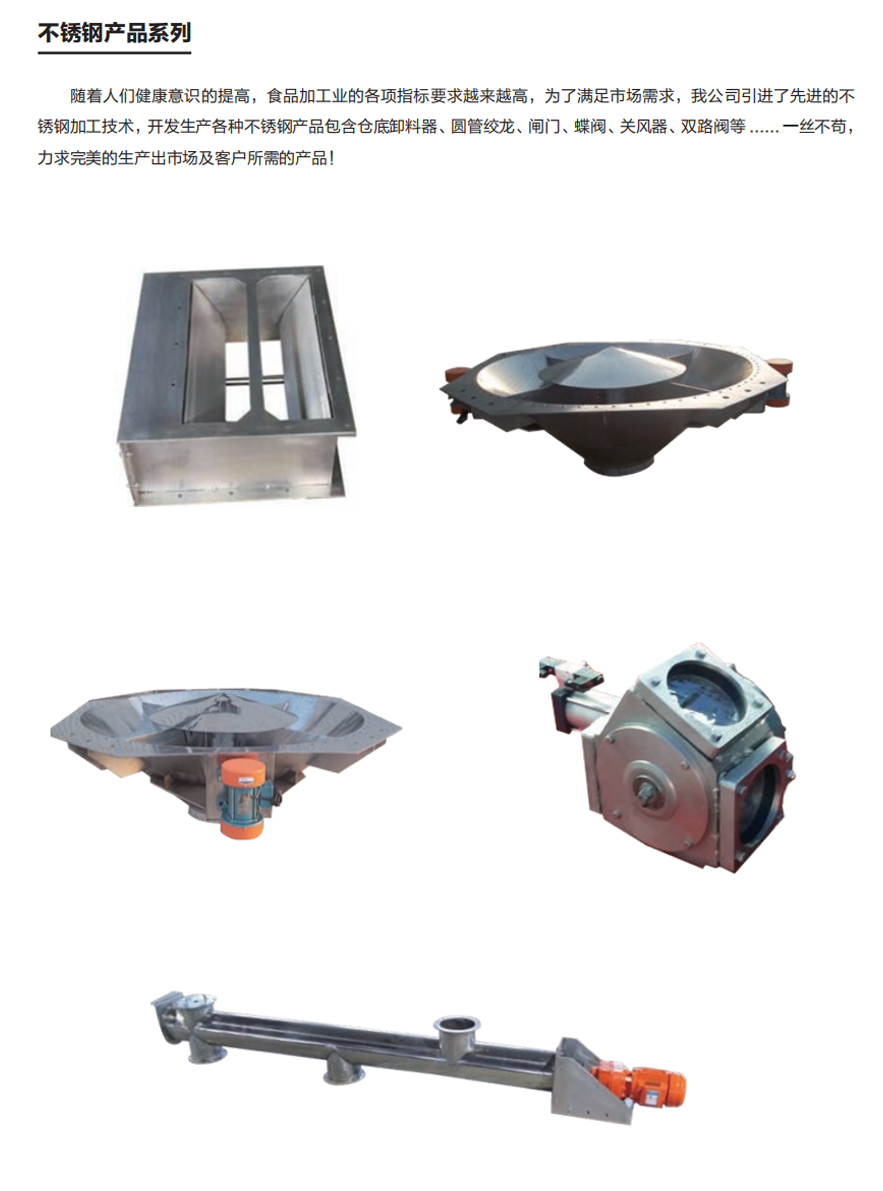 • 随着人们健康意识的提高,食品加工业的各项指标要求越来越高,为了满足市场需求,我公司引进了先进的不锈钢加工技术,开发生产各种不锈钢产品包含仓底卸料器、圆管绞龙、闸门、蝶阀、关风器、双路阀等 ...... 一丝不苟,力求完美的生产出市场及客户所需的产品!